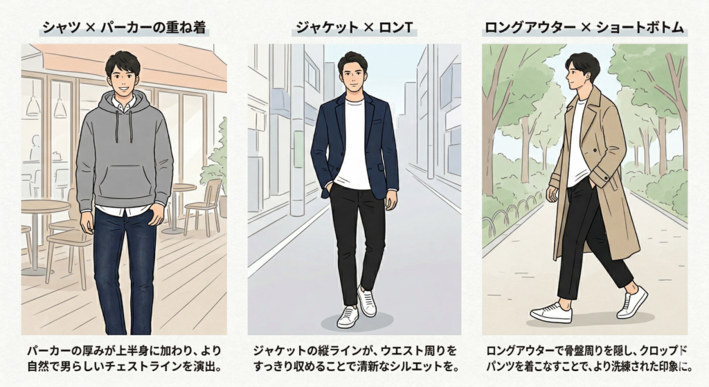 重ね着(レイヤード)は、骨格をカバーしながらコーディネートのおしゃれ感もアップできる万能テクニックです。