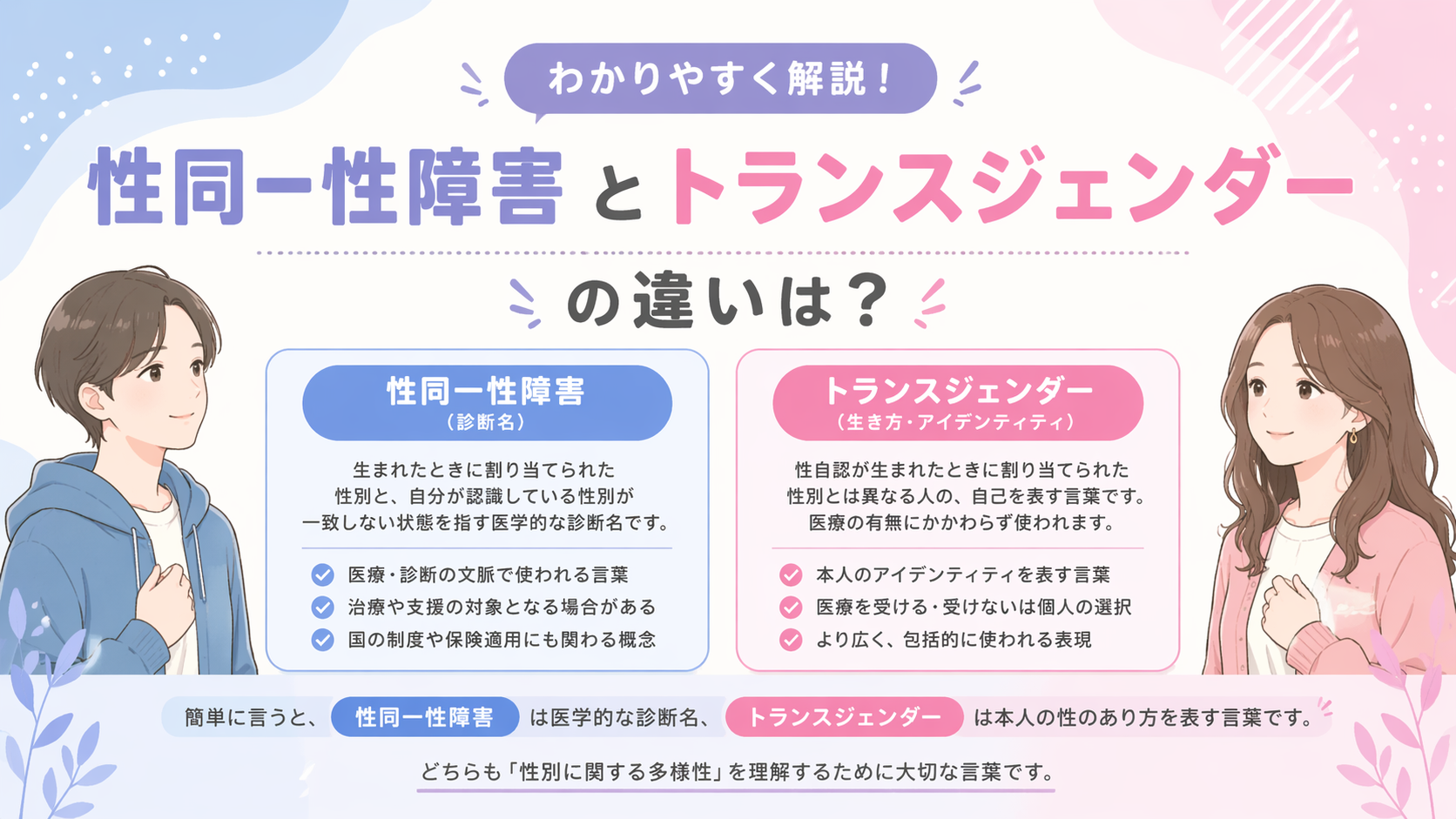 最近、テレビやネットで「トランスジェンダー」という言葉を当たり前のように目にするようになりました。一方で、昔からある「性同一性障害」という言葉も根強く残っています。